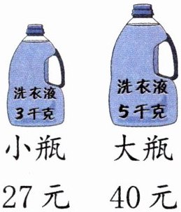 买大瓶的洗衣液更合算 解析:先求出小瓶的洗衣液每千克是 $ 27 ÷ 3 = 9 $(元),大瓶的洗衣液每千克是 $ 40 ÷ 5 = 8 $(元),通过比较可知,大瓶的洗衣液每千克的价钱低一些,所以买大瓶的洗衣液更合算。