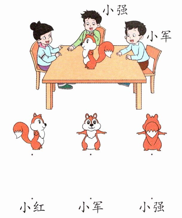 点拨:观察得出,小红、小军和小强分别坐在玩具的前面、后面和侧面,他们分别看到的是玩具的前面、后面和侧面。