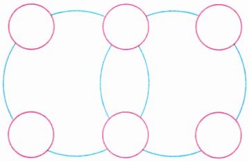 解析:每个大圆圈上的四个数字的和都是15,则两个大圆圈上的数字的和是 $ 15 + 15 = 30 $,而 $ 1 + 2 + 3 + 4 + 5 + 6 = 21 $,比30少了9,因为中间两个小圆圈上的数字多算了一次,即中间两个小圆圈上的数字的和是9。因此,先填中间两个小圆圈上的数字,且和为9。通过尝试,发现填4、5不成立,只能填3、6,然后根据和都是15填出其他的数字。
