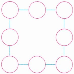 解析:若正方形每条边上数字的和是5,则正方形四条边上数字的和应是 $ 5 × 4 = 20 $,实际是13,相差 $ 20 - 13 = 7 $,因为四个角上都被重复计算了一次,由 $ 2 + 2 + 2 + 1 = 7 $ 可知,四个角上应填1、2、2、2。然后根据每条边上数字的和是5填出其他的数字。
