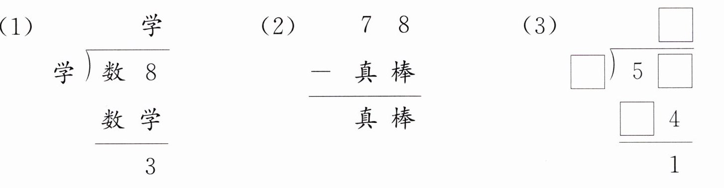 (1)数 = 2 学 = 5 (2)真 = 3 棒 = 9 解析:由被减数的个位上是 8 可知,棒 + 棒 = 8 或 18,则棒 = 4 或 9。若棒 = 4,则真 + 真 = 7,由于相同的汉字代表的数字是相同的,它们的和不可能是 7,所以棒不可能是 4,棒只能是 9。由棒 = 9 推出真 + 真 + 1 = 7,即真 = 3。 (3)