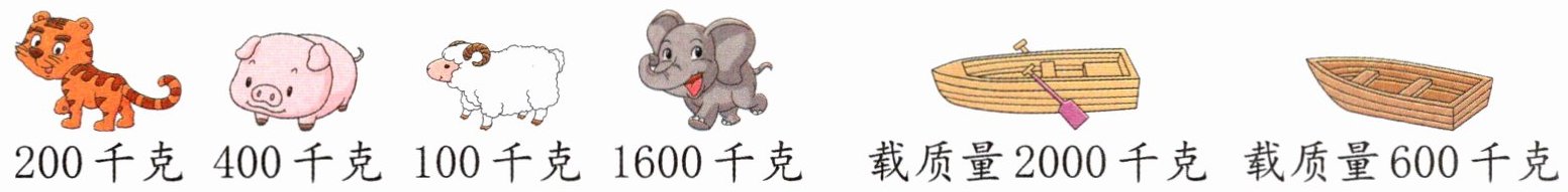 答案不唯一,如猪和羊乘载质量600千克的船,老虎和象乘载质量2000千克的船 解析:要知道哪几只动物能乘同一条船,就用这几只动物的总质量与船的限重进行比较,如果它们的总质量小于或等于船的载质量,那么能乘同一条船,反之不能。因为象的体重是1600千克,所以它只能乘载质量2000千克的船,因为2000-1600=400(千克),所以只要从另外3只动物中选出总质量小于或等于400千克的动物乘载质量2000千克的船,最后让剩下的动物乘载质量600千克的船