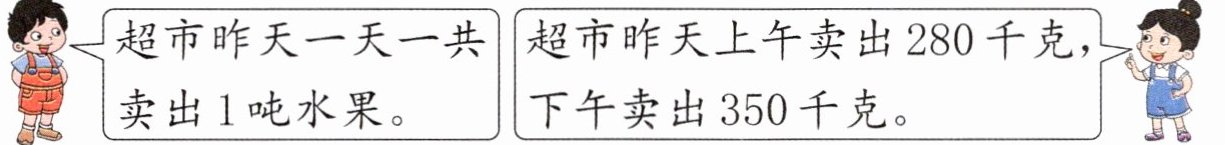 1吨=1000千克 1000-280-350=370(千克) 解析:要先统一单位,把1吨改写成以千克为单位的数,即1吨=1000千克。要求超市昨天晚上卖出多少千克水果,用昨天一天超市卖出的水果总质量减去昨天上午卖出的水果质量和昨天下午卖出的水果质量即可。
