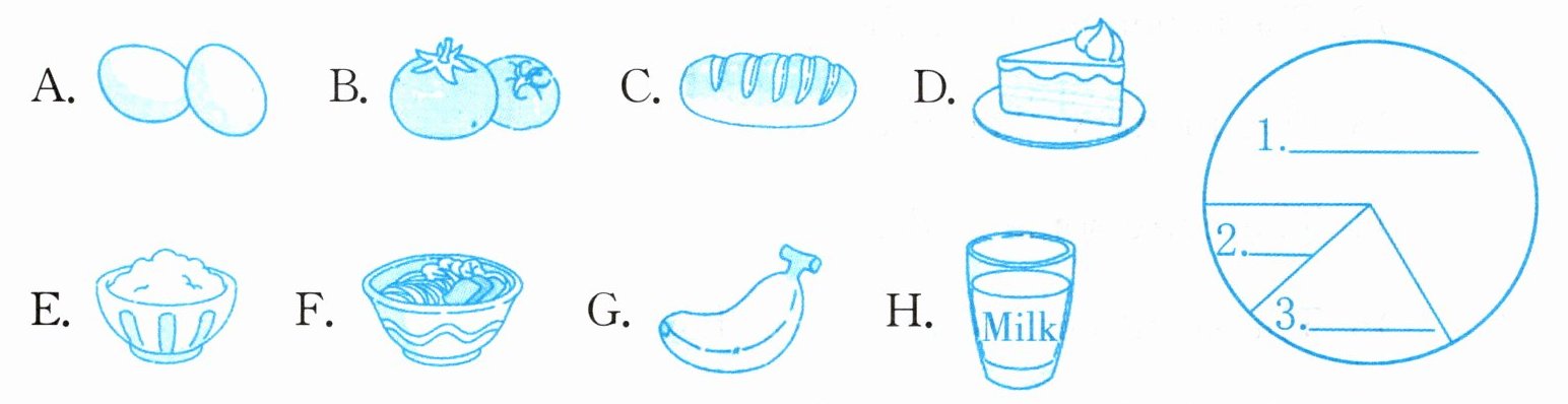 任务二:根据短文内容,将图片序号填在盘子中的横线上,组成营养均衡的一日饮食。