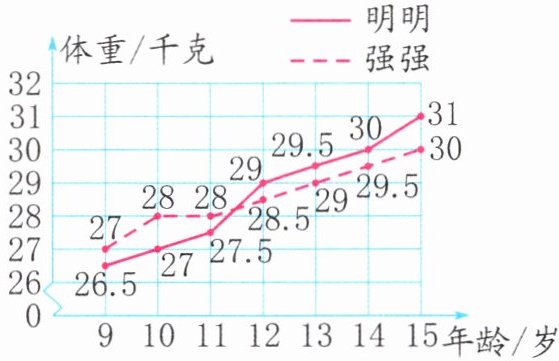 8. 右面是明明和强强9~15岁体重变化情况统计图。