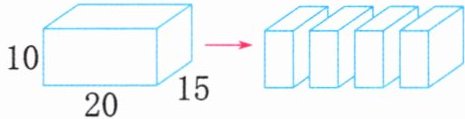 4. 1 个长方体木块,长 20 厘米,宽 15 厘米,高 10 厘米,现在把木块锯成 4 个小长方体木块(如图,单位:厘米)。这 4 个小长方体木块的表面积之和是多少平方厘米?