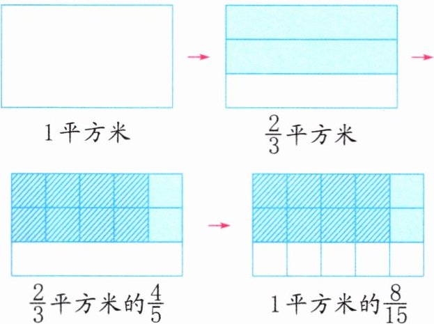 点拨:要求$\frac {2}{3}×\frac {4}{5}$的积是多少,就是要把$\frac {2}{3}$平方米平均分成5份,取其中的4份。$\frac {2}{3}$平方米是1平方米的$\frac {2}{3}$,可以用下面的示意图表示分的过程。