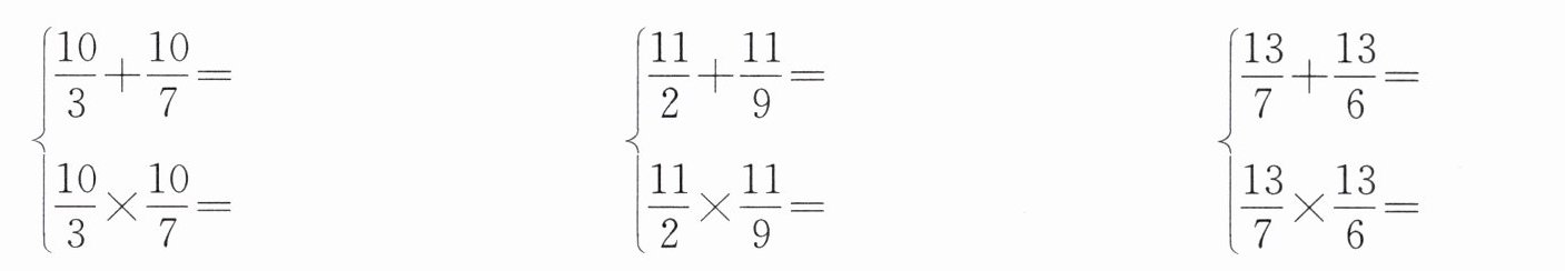 1. $\frac{10}{3}+\frac{10}{7}=\frac{70 + 30}{21}=\frac{100}{21}$,$\frac{10}{3}×\frac{10}{7}=\frac{100}{21}$;$\frac{11}{2}+\frac{11}{9}=\frac{99 + 22}{18}=\frac{121}{18}$,$\frac{11}{2}×\frac{11}{9}=\frac{121}{18}$;$\frac{13}{7}+\frac{13}{6}=\frac{78 + 91}{42}=\frac{169}{42}$,$\frac{13}{7}×\frac{13}{6}=\frac{169}{42}$。等于