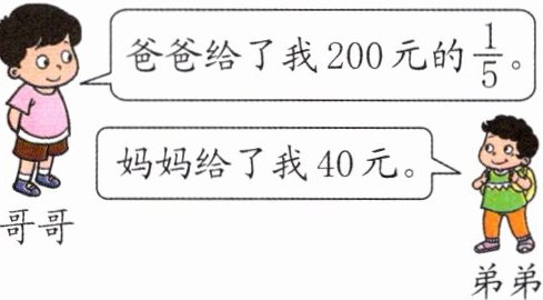 点拨:先计算爸爸给哥哥的钱,是将“200 元”看作单位“1”,即“200 元的$\frac {1}{5}$”。再计算哥哥给弟弟的钱,是将“爸爸给哥哥的钱”看作单位“1”,即“爸爸给的钱的$\frac {1}{5}$”。最后加上“妈妈给弟弟的 40 元”,即可算出弟弟现在一共有多少元。