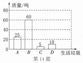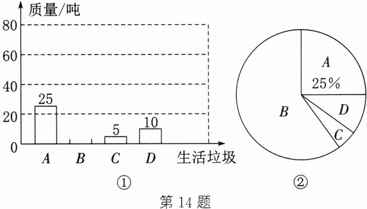 14. (16分)生活垃圾一般可分为四大类:可回收物(A)、厨余垃圾(B)、有害垃圾(C)和其他垃圾(D).某垃圾处理厂调查了附近居民日常生活产生垃圾的情况,并根据调查结果分别绘制了不完整的条形统计图和扇形统计图(如图①②).