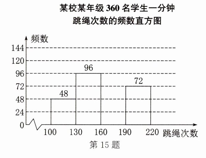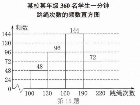 15. (16分)为了解某校某年级学生一分钟跳绳的情况,对该年级360名学生进行一分钟跳绳测试,并把测得的数据分成四组,绘制成如下频数表和如图所示的不完整的频数直方图(每一组不含前一个边界值,含后一个边界值).