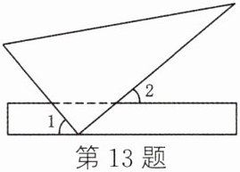 13. 如图,将一把三角尺的直角顶点放在直尺的一边上。若$∠1 = 50^{\circ}$,则$∠2 = $____。