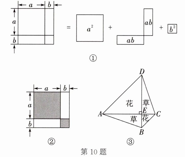 10. 用等式表示图①中图形的面积为$(a+b)^{2}= a^{2}+2ab+b^{2}$.