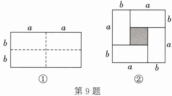 9. 如图①所示为一个长为$2a$、宽为$2b$的长方形,沿图中虚线用剪刀均分成四个小长方形,然后按图②的形状拼成一个正方形.