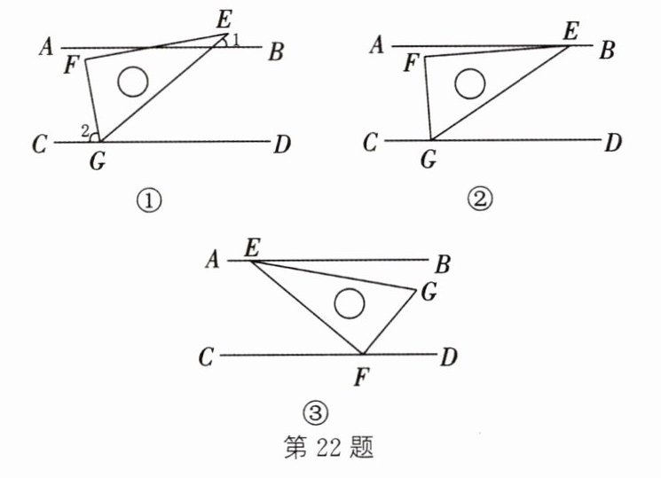 22. (10分)新考法 探究题 在综合与实践课上,老师让同学们以“两条平行线$AB$,$CD和一把含60^{\circ}角的三角尺EFG$($∠EFG = 90^{\circ}$,$∠EGF = 60^{\circ}$)”为主题开展数学活动。