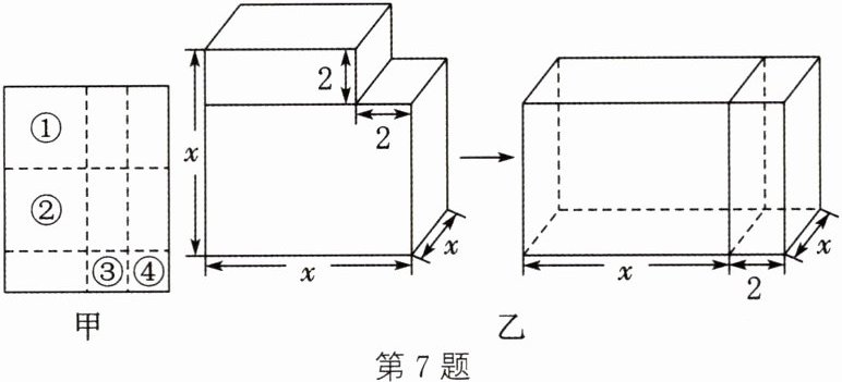 7. 如图甲,将一张长方形纸板按图中虚线裁剪成 9 块,若图中①②都是边长为 $ a $ 的大正方形,③④都是边长为 $ b $ 的小正方形,剩下的都是边长分别为 $ a $,$ b $ 的小长方形.