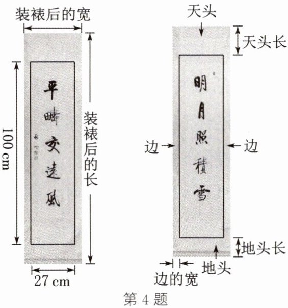 4. 新考向 传统文化 (北京中考)对联是中华传统文化的瑰宝,对联装裱后如图所示,上、下空白处分别称为天头和地头,左、右空白处统称为边.一般情况下,天头长与地头长的比是6:4,左、右边的宽相等,均为天头长与地头长之和的$\frac{1}{10}$.某人要装裱一副对联,对联的长为100cm,宽为27cm.若要求装裱后的长是装裱后的宽的4倍,求边的宽和天头长.(书法作品选自《启功法书》)