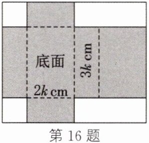 16. 如图,把一张长方形纸板裁去两个边长为 3cm 的小正方形和两个相同的小长方形,再把剩余部分(涂色部分)沿虚线折起,恰好可以折成一个有底有盖的长方体纸盒,纸盒底面长方形的长为$3kcm$,宽为$2kcm$.