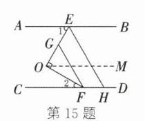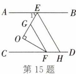 15. 如图,$AB// CD$,点$E$,$F分别在AB$,$CD$上,且$OE⊥OF$. 分别在$OE$,$CD上取点G$,$H$,使$FO平分∠CFG$. 要使$FG// EH$,那么$∠1与∠BEH$应满足的数量关系是______.