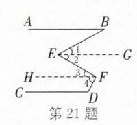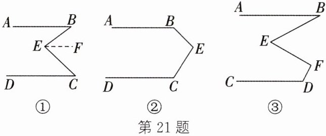 21. (9 分)新考法 探究题 (1)问题发现:如图①,直线$AB// CD$,$E为AB$,$CD$之间一点,连结$BE$,$CE$,可以发现$∠BEC = ∠B + ∠C$. 请把下面的过程补充完整: