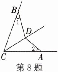 8. 如图,D是∠ACB内一点。若∠1= 35°,∠2= 40°,∠ADB= 145°,则∠ACB的大小为 ()