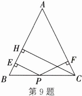 9. 如图,在△ABC中,AB= AC,P为底边BC上一点,PE⊥AB于点E,PF⊥AC于点F,CH⊥AB于点H。求证:PE+PF= CH。