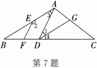 7. 如图,在△ABC中,点D在边BC上,EF//AD,且EF分别交AB,BC于点E,F,DG平分∠ADC,交AC于点G,∠1+∠2= 180°。