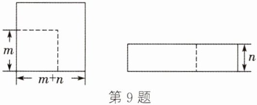 9. 如图,在边长为$m+n$的正方形纸片中剪去一个边长为m的小正方形纸片之后,剩余部分又剪拼成一个长方形(不重叠、无缝隙)。若拼成的长方形的一边长为n,则与其相邻的另一边长为()