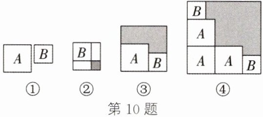 10. 如图①,有两张正方形纸片A,B。将B放在A的内部得到图②。如图③,将A,B并列摆放后,构造出一个新的正方形。若图②和图③中涂色部分的面积分别为1和12,现将三张正方形纸片A和两张正方形纸片B按如图④所示的方式摆放,则图④中涂色部分的面积为()