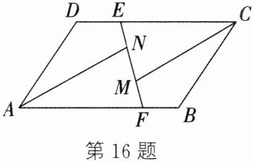 16. (8分)如图,在$□ ABCD的边AB$,$CD上截取AF$,$CE$,使得$AF= CE$,连结$EF$,$M$,$N是线段EF$上的两点,且$EM= FN$,连结$AN$,$CM$。