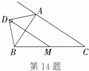 14. 如图,在$\triangle ABC$中,$M为BC$的中点,$AD为\triangle ABC$的外角平分线,且$AD⊥BD$,连结$MD$。若$AB= 6$,$AC= 9$,则$MD$的长为______。