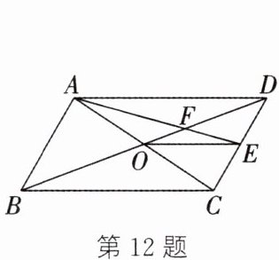 12. 如图,$O是□ ABCD的对角线AC$,$BD$的交点,$E为CD$的中点,$AE交BD于点F$,连结$OE$。若$S_{\triangle AOE}= 3$,则$S_{\triangle AOB}= $______。