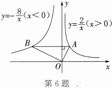 6. (郴州中考)如图,在函数 $ y = \frac{2}{x}(x > 0) $ 的图象上任取一点 $ A $,过点 $ A $ 作 $ y $ 轴的垂线,交函数 $ y = -\frac{8}{x}(x < 0) $ 的图象于点 $ B $,连结 $ OA $,$ OB $,则 $ \triangle AOB $ 的面积是 ( )