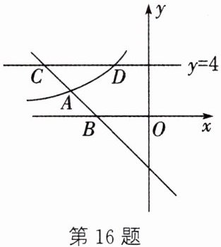 16. (10分)如图,一次函数 $ y = -x + b $ 的图象与反比例函数 $ y = -\frac{k}{x}(x < 0) $ 的图象交于点 $ A(-6, m) $,与 $ x $ 轴交于点 $ B(-4, 0) $.