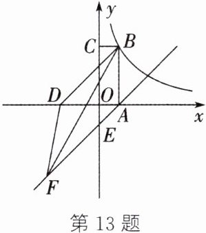 13. 如图,矩形 $ OABC $ 的顶点 $ B $ 在反比例函数 $ y = \frac{k}{x}(x > 0) $ 的图象上,点 $ A $ 在 $ x $ 轴的正半轴上,$ AB = 3BC $,点 $ D $ 在 $ x $ 轴的负半轴上,$ AD = AB $,连结 $ BD $,过点 $ A $ 作 $ AE // BD $,交 $ y $ 轴于点 $ E $,点 $ F $ 在 $ AE $ 上,连结 $ FD $,$ FB $. 若 $ \triangle BDF $ 的面积为 9,则 $ k $ 的值是______.