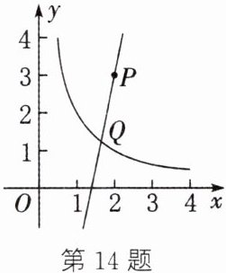 14. (内江中考)如图,一次函数 $ y = kx + b $ 的图象经过点 $ P(2, 3) $,与反比例函数 $ y = \frac{2}{x}(x > 0) $ 的图象在第一象限内交于点 $ Q(m, n) $. 若一次函数中的 $ y $ 的值随 $ x $ 值的增大而增大,则 $ m $ 的取值范围是______.