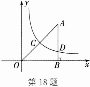 18. (12分)(金华中考)如图,点 $ A $ 在第一象限内,$ AB \perp x $ 轴于点 $ B $,反比例函数 $ y = \frac{k}{x}(k \neq 0, x > 0) $ 的图象分别交 $ AO $,$ AB $ 于点 $ C $,$ D $. 已知点 $ C $ 的坐标为 $ (2, 2) $,$ BD = 1 $.