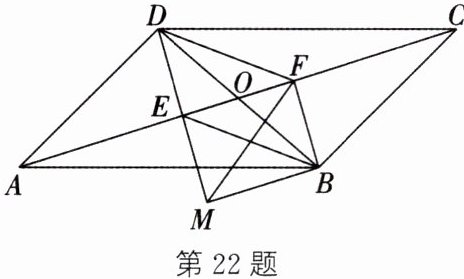 22. (8 分)如图,在$□ ABCD$中,对角线 AC 与 BD 相交于点 O,点 E,F 在 AC 上,且$OE= OF$,连结 DE 并延长至点 M,使$DE= ME$,连结 MF,DF,BE,BF,BM.