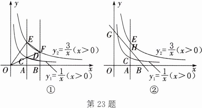 23. (12 分)如图①,在平面直角坐标系中,线段 AB 在 x 轴的正半轴上移动,且$AB= 1$,过点 A,B 作 y 轴的平行线,分别交函数$y_{1}= \frac{1}{x}(x>0)与y_{2}= \frac{3}{x}(x>0)$的图象于点 C,E 和点 D,F,设点 A 的横坐标为$m(m>0)$.