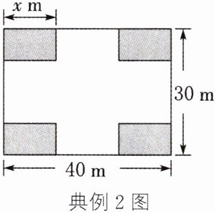 点拨 (1) ① 根据图形可得出出口的宽度. ② 根据“出口的宽度不小于 $ 14 \mathrm { m } $,不大于 $ 26 \mathrm { m } $”列不等式组,可求得 $ x $ 的取值范围. (2) 先根据“活动区的面积 $ = $ 矩形的面积 $ - $ 四块绿化区的面积”列出函数表达式,再根据二次函数的增减性可求得函数的最大值.