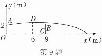 9. 如图,排球运动员站在点O处练习发球,将球从点O正上方2m的点A处发出,把球看成点,其运行的高度 $ y(m) $ 与运行的水平距离 $ x(m) $ 满足表达式 $ y = a(x - k)^{2} + h $. 已知球与点O的水平距离为6m时,达到最高点D,高度为2.6m,球网BC与点O的水平距离为9m,它的高度为2.43m,球场的边界距点O的水平距离为18m,则下列判断中,正确的是(
