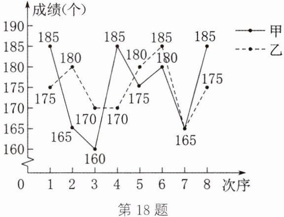 18.(14分)(恩施中考)九年级一班准备从甲、乙两名男生中选派一名参加学校组织的一分钟跳绳比赛,在相同的条件下,分别对两名男生进行了8次一分钟跳绳测试。现将测试结果绘制成如下不完整的统计表和如图所示的统计图。请根据统计图表中的信息,解答下列问题: