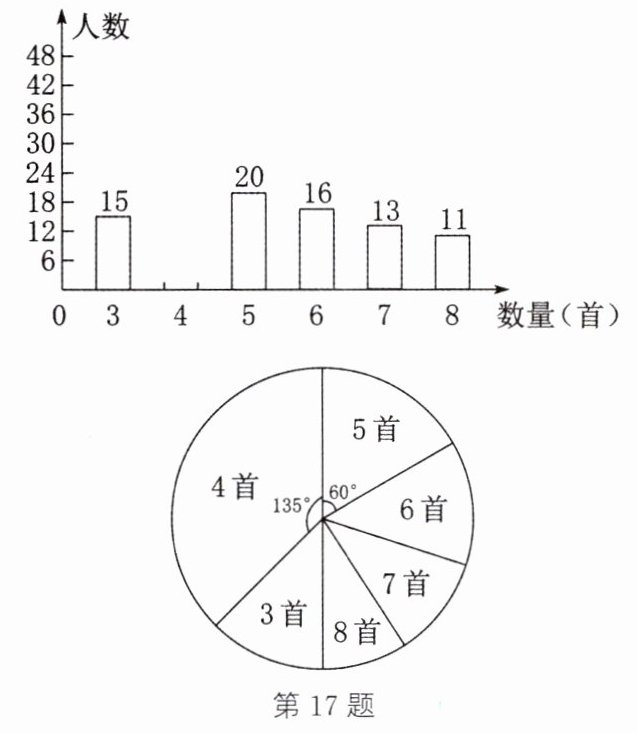 17.(14分)某校倡导全校1200名学生进行经典诗词背诵活动,并在活动之后举办经典诗词大赛。为了了解本次系列活动的持续效果,学校团委在活动启动之初,随机抽取部分学生调查一周的诗词背诵数量,根据调查结果绘制成的统计图(部分)如图所示。大赛结束后一个月,再次抽查这部分学生一周的诗词背诵数量,绘制成如下统计表: