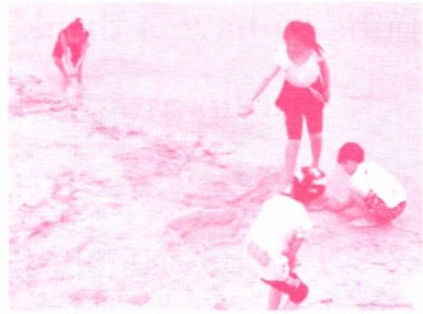 I think the children may cry because all their hard work turns to nothing, but they surprise me. They run away from the water, hand in hand, and sit down to build another one.