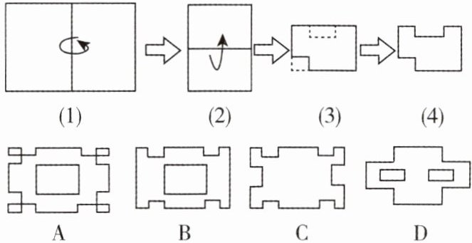 将一张长方形纸按图中(1)、(2)的方式依次对折后,再沿(3)中的虚线裁剪,最后将(4)中的纸片打开铺平,所得到的图案应该是下面图案中的( ).