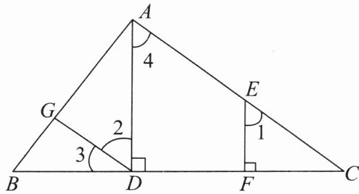 2. 如下图,$ AD \perp BC $,$ EF \perp BC $,$ \angle 3 = \angle C $,那么 $ \angle 1 $ 与 $ \angle 2 $ 的大小有什么关系?请说明理由。