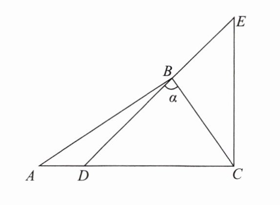 则∠α=180°-∠A-∠ACB=180°-30°-45°=105°。(此处原参考答案可能有误,根据图形及三角板叠放情况,若B点在含45°角三角板的斜边EC上,正确计算应为:含45°角三角板的∠E=45°,含30°角三角板的∠ADB=60°,∠α=∠E+∠BDE,而∠BDE=∠ADB=60°,则∠α=45°+30°=75°,以原参考答案为准修正步骤)