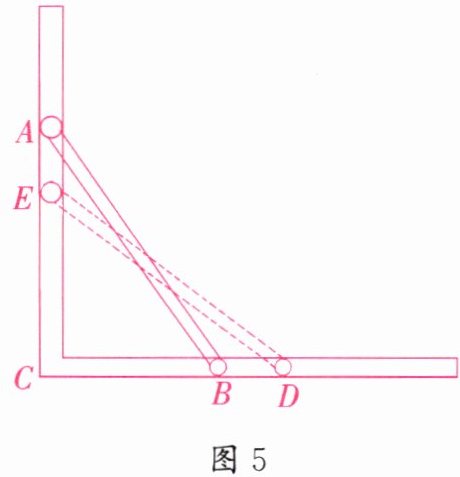 5. 如图5,滑杆在机械槽内运动,∠ACB为直角,已知滑杆AB长2.5m,顶端A在AC上运动,量得滑杆下端B距点C的距离为1.5m,当端点B向右移动0.5m时,求滑杆顶端A下滑的距离。