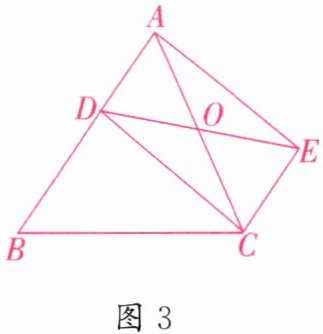 1. 如图 3,已知 $D$ 是 $\triangle ABC$ 的边 $AB$ 上一点,$CE // AB$,$DE$ 交 $AC$ 于点 $O$,且 $OA = OC$,猜想线段 $CD$ 与线段 $AE$ 的大小关系和位置关系,并加以证明。