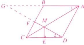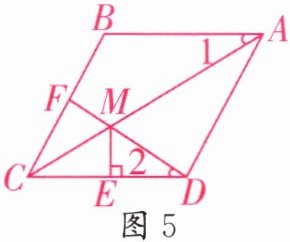1. 如图 5,在菱形 $ABCD$ 中,点 $F$ 为边 $BC$ 的中点,$DF$ 与对角线 $AC$ 交于点 $M$,过点 $M$ 作 $ME \perp CD$ 于点 $E$,$\angle 1 = \angle 2$。